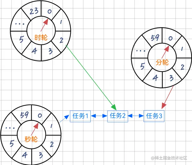 比如说上图中:任务二要在第 2 小时执行,所以任务二就会在时轮转到 2 的时候再放入分轮中去,分轮转到 3 后再放入到秒轮,然后秒轮就在 1 的时候执行了任务2。