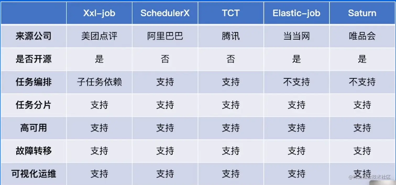 - Xxl - job : 开发迅速,易拓展,支持分片,支持简单的任务依赖和子任务依赖,不是跨平台的。开源免费,轻量级,开箱即用,操作简单易上手,在中小型公司使用广泛。