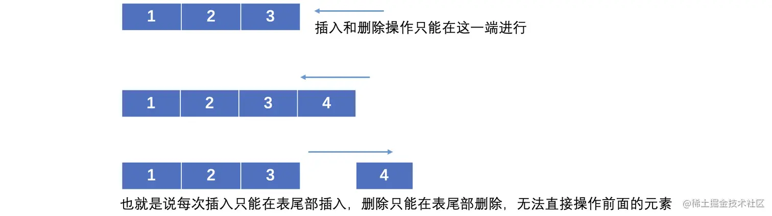 队列有队头和队尾,遵循先来后到的原则,队列中的元素只能从队尾进入,只能从队首出去,也就是说,入队顺序为1、2、3、4,那么出队顺序也一定是1、2、3、4,所以队列是一种先进先出(FIFO,First In, First Out)的数据结构。