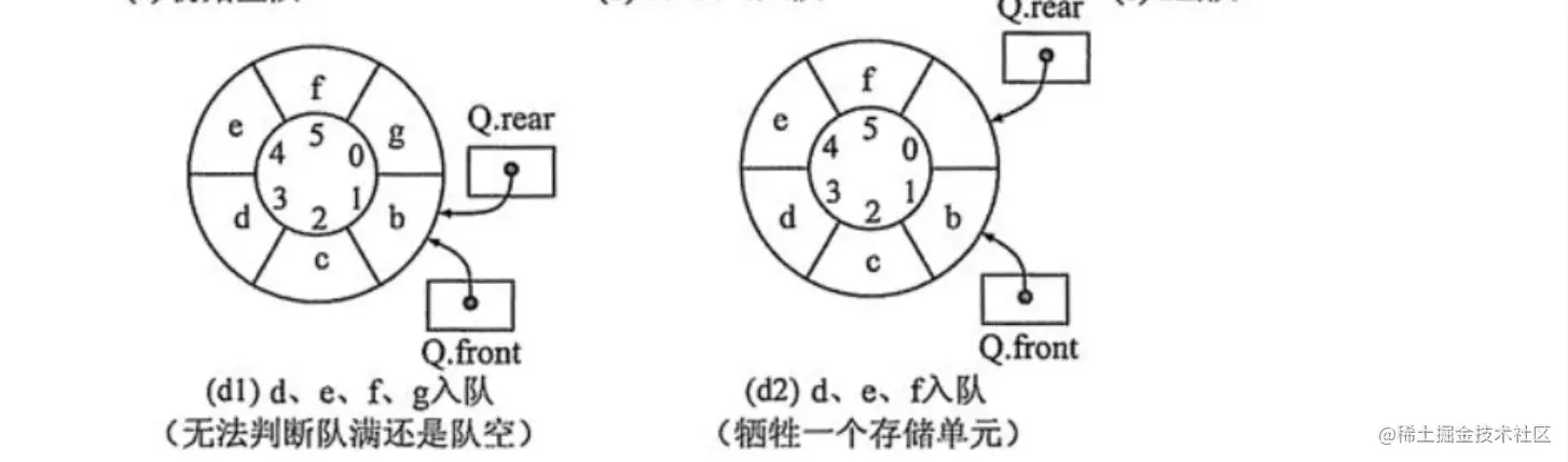 由于队首指针和队尾指针重合时表示队列为空,所以我们只能舍弃一个存储单元,当队尾距离队首一个单元的时候,表示队列已满。