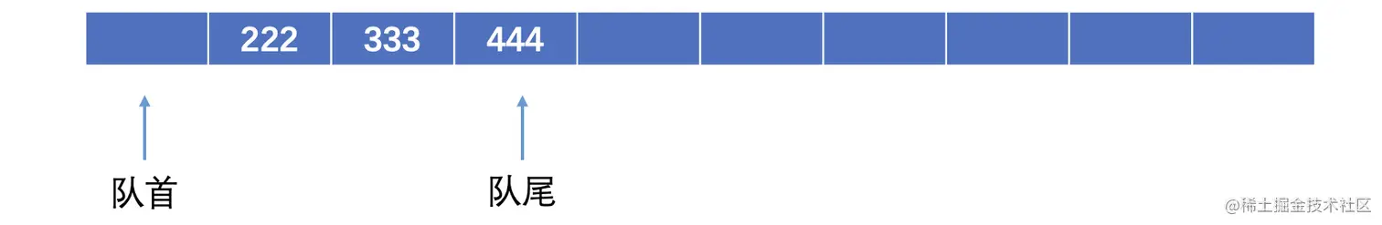 存在这样一个问题,这个队列是一次性的,如果队列经过反复出队入队操作,那么最后指针会直接指向数组的最后,如果我们延长数组的话,也不可能无限制的延伸下去。一般采用循环队列的形式,来实现重复使用一个数组(不过就没办法扩容了,大小是固定的)