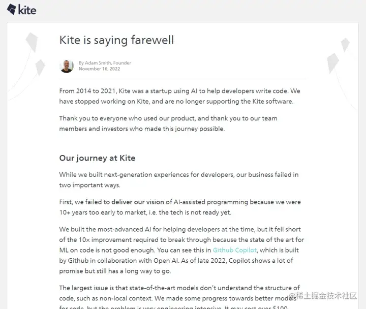 1、虽然chatGPT的能力让人们惊叹,就AI编码领域来看,它所能提供的帮助还没有被认可,从行业先锋Kite的CEO的告别信中,可以窥知一二。