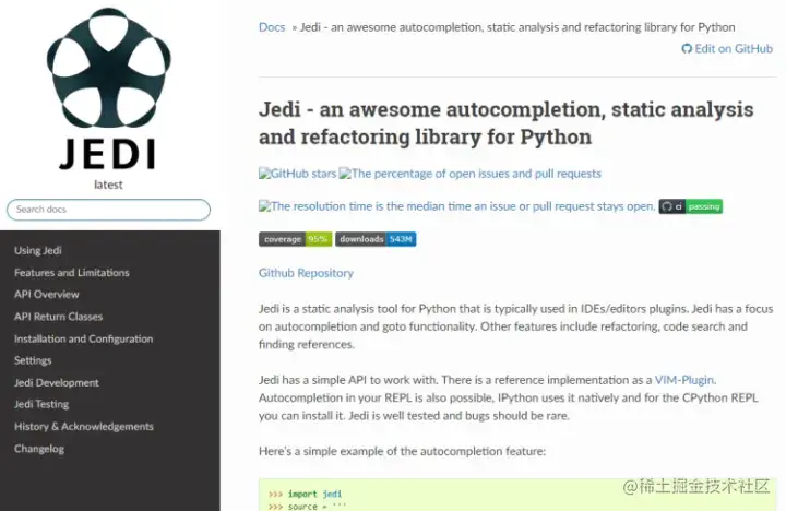 Jedi 是 Python 的静态分析工具,通常用于 IDE/编辑器插件。Jedi 专注于自动完成和转到功能。其他功能包括重构、代码搜索和查找参考。