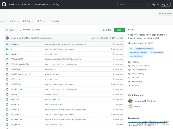 研究人员使用来自公开可用的 GitHub 项目的大约 835 万个代码实例以及用户评论来训练 CodeT5。这些数据集大部分是从 CodeSearchNet 数据集获得的,其中包含来自 BigQuery 的两个 C 和 C# 数据集,以及 Ruby、JavaScript、Go、Python、PHP 以及 C 和 C#。