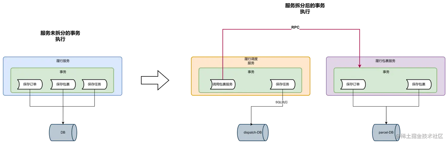 服务层的拆分举个例子来说,以物流的履行系统来说,一开始的履行系统中会保存物流订单、物流包裹数据以及调度任务数据,项目初始时保存物流订单、保存物流包裹、保存调度任务是在一个服务中完成并且通过事务保证数据的完整性。但是由于后续的发展,物流订单和物流包裹数据需要独立一个物流包裹服务,那么原来在同一个服务同一个数据库中完成的事务操作,演变成了先调用包裹服务的RPC接口,然后再调用本身的调度任务的保存,那么如果调度任务保存失败,那么物流包裹也无法回滚。