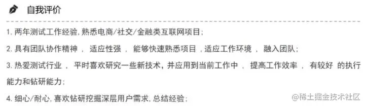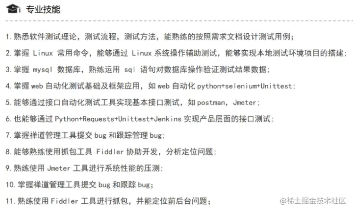 - 求职岗位:体现专一性,可以具体化,如,软件测试工程师、自动化测试工程师、性能测试工程师