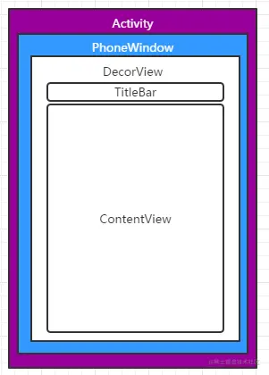 大家都很熟悉吧,这张图片描述了Activity的结构,简单总结一句话就是:一个Activity,内部有一个PhoneWindow,PhoneWindow内部有一个DecorView,我们通常调用的方法setContentView(R.layout.xxx)其实是将自己写写的布局放在上图的ContentView部分。