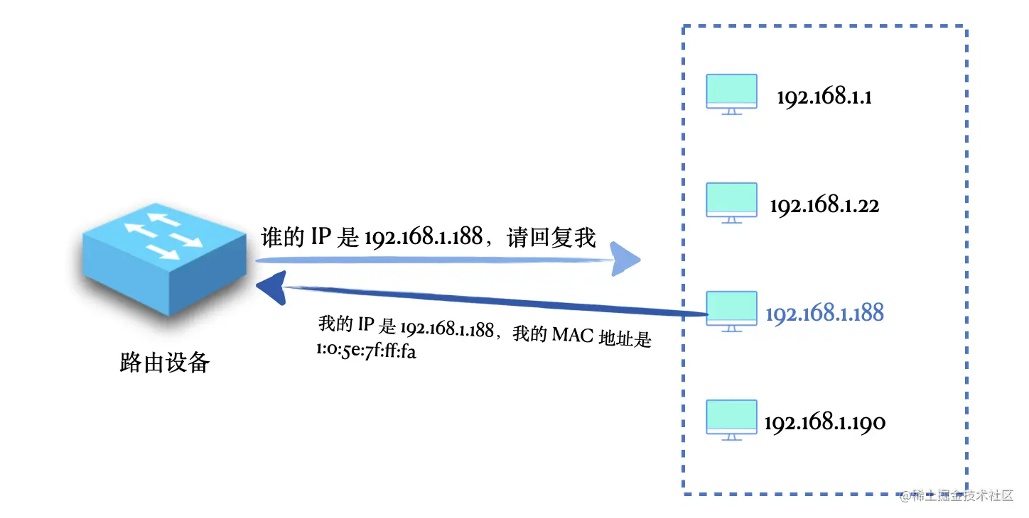 当一台路由器或者一个具有路由转发功能的主机想要通过一个 IP 地址得到对应的 MAC 地址时,就可以使用 ARP 协议了,这个设备向它所在的目标子网中发送一个广播的 ARP 请求,请求中带着这个 IP 地址,意思是说,在这个网络中的各位,谁的 IP 是这个,请回复我一下,并告诉我你的 MAC 地址。收到这个请求的主机对这个 ARP 包进行解析,如果发现携带的 IP 正好是自己的,就返回一个 ARP 回复,回复中带上自己的 MAC 地址。