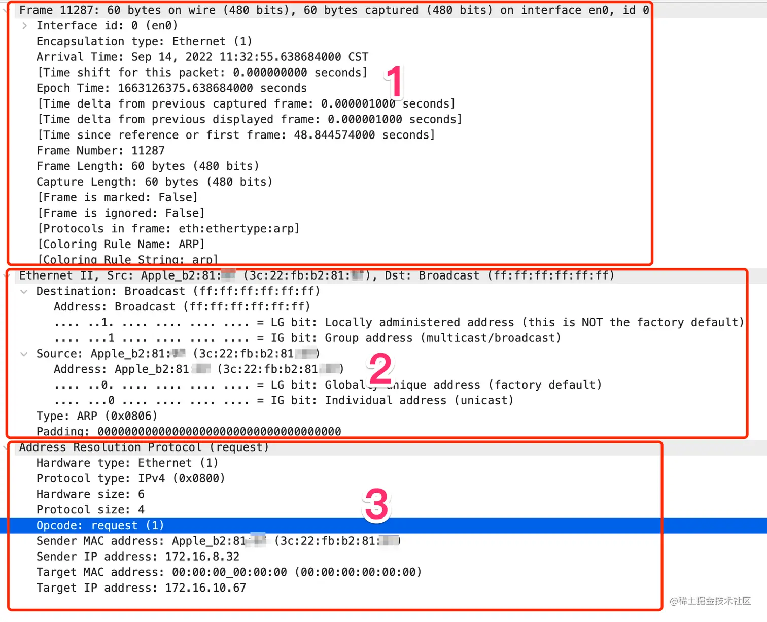 1、目的 MAC 地址,都是 ff,表示这是个广播请求,ARP 请求本身就是广播的。