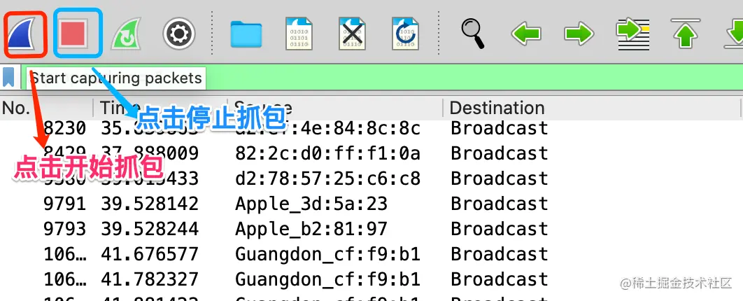 打开 Wireshark ,开始抓包,等待一会儿,然后停止抓包。你电脑中的各个程序会偷偷的发送和应答很多 ARP 包,