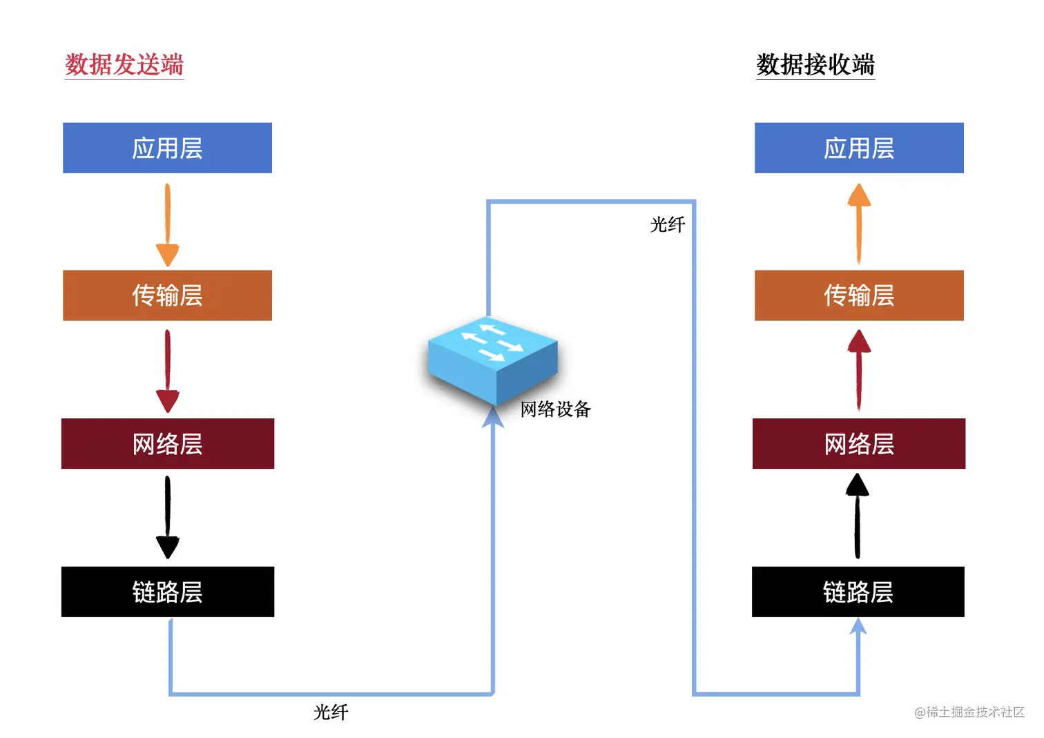下面这张图是网络 4 层模型以及数据从发送端到接收端的首发过程。发送是从上向下经过层层包装,最后形成一个数据帧(最常用的以太网帧),之后这个数据在纷繁复杂的网络世界中勇往直前,到达接收端,接收端从下向上层层拆包,最后供应用层使用。