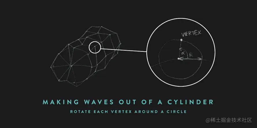 为了制造海浪,我们将围绕圆柱体的初始位置对每个顶点旋转。通过给它们一个随机旋转速度和一个随机距离(旋转半径)。很抱歉,这里还是需要用到一些三角函数!