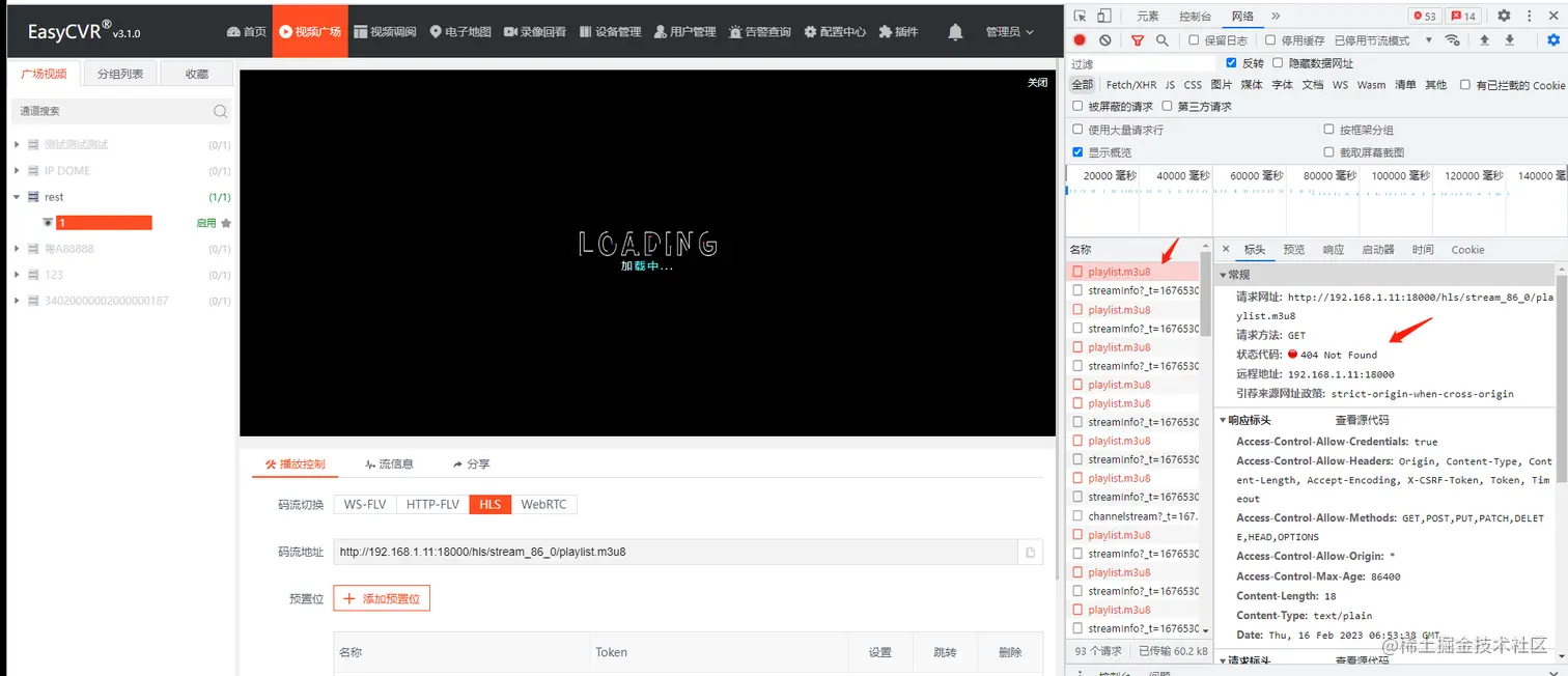 接到反馈后我们立即进行了排查。技术人员打开F12查看接口发现,调用HLS接口时返回了404,由此可以判断,是因为HLS的路径错误,导致服务查找HLS生成的地址失败,因此无法播放,如图所示: