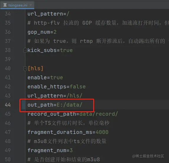 找到问题原因后,解决起来较为简单了。打开mediaserver目录下tsingsee.ini文件,在hls栏目中的out_path路径最小目录应为hls,将其设置为E:/data/hls即可。