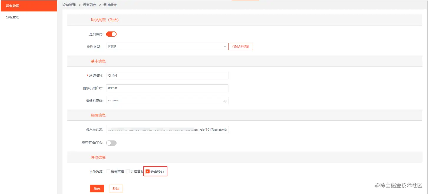 在我们很多的项目中,用户对视频流的转码需求也很多(H.265视频流转H.264视频流)。对于接入摄像头不是很多的现场,用户可以通过手动配置对视频进行转码,如图: