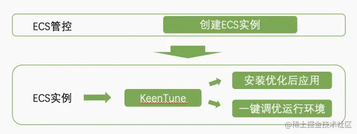 在售卖页选择“应用加速”,KeenTune 会从阿里云 ECS 管控侧接收到需要进行调优的应用,在新购买的倚天实例上安装已经经过编译优化的应用版本,并且使用“一键专家调优”功能,提供包括 CPU、内存、IO、网络及安全及应用本身的优化,从而实现开机即用的全栈调优。