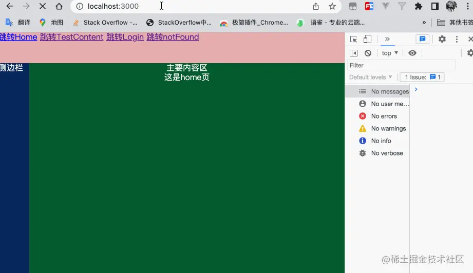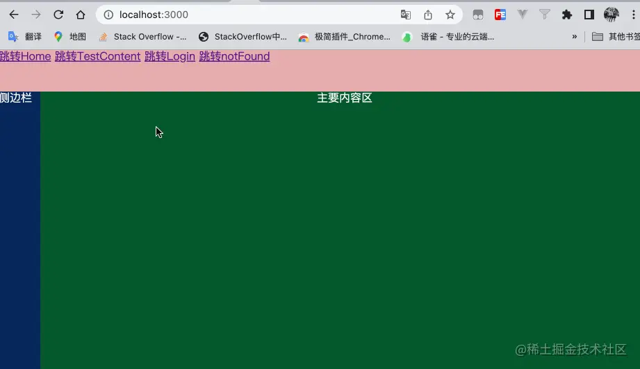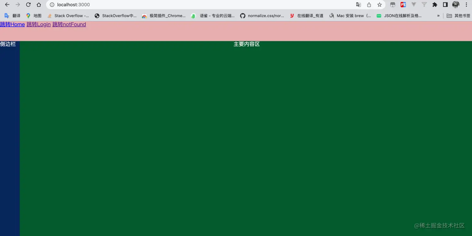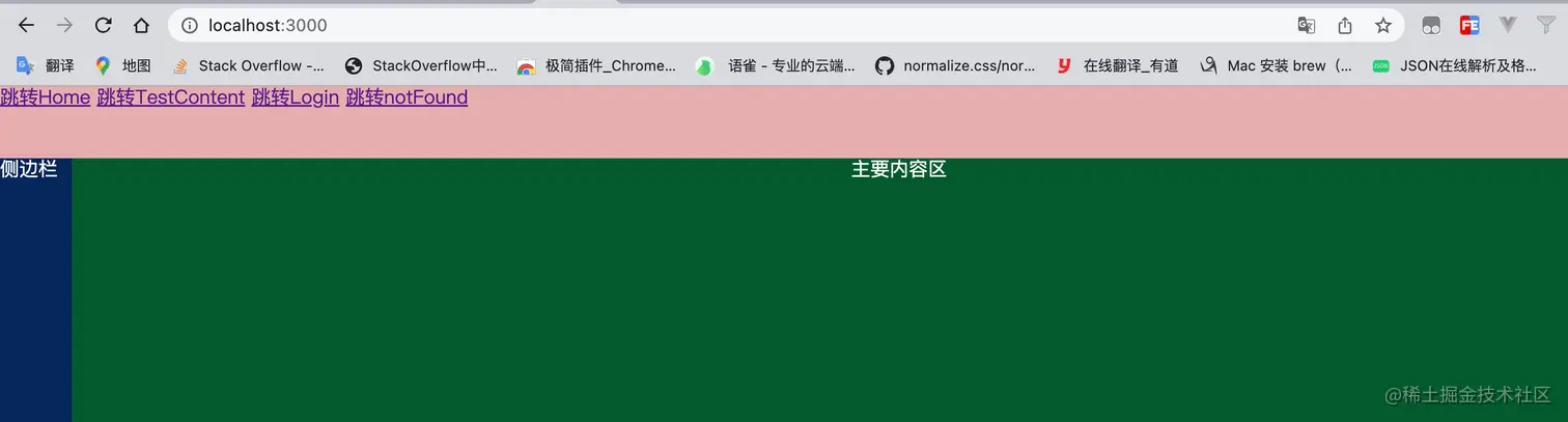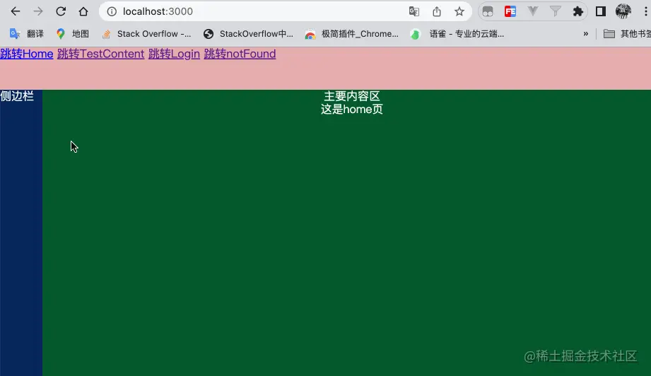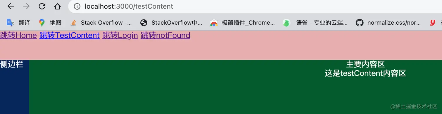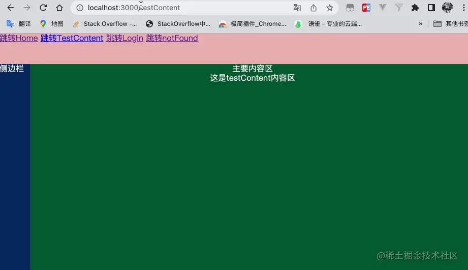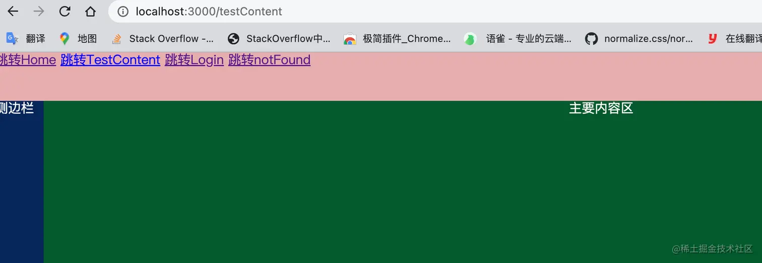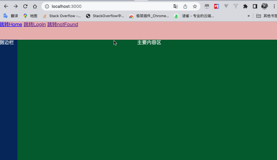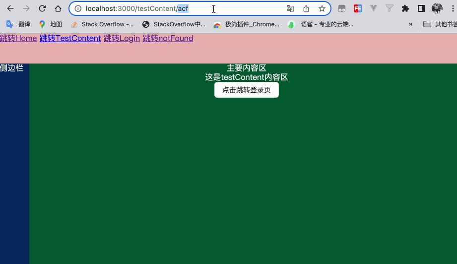 好了,我们完善代码后就可以在地址进行测试我们的路由配置关系了: