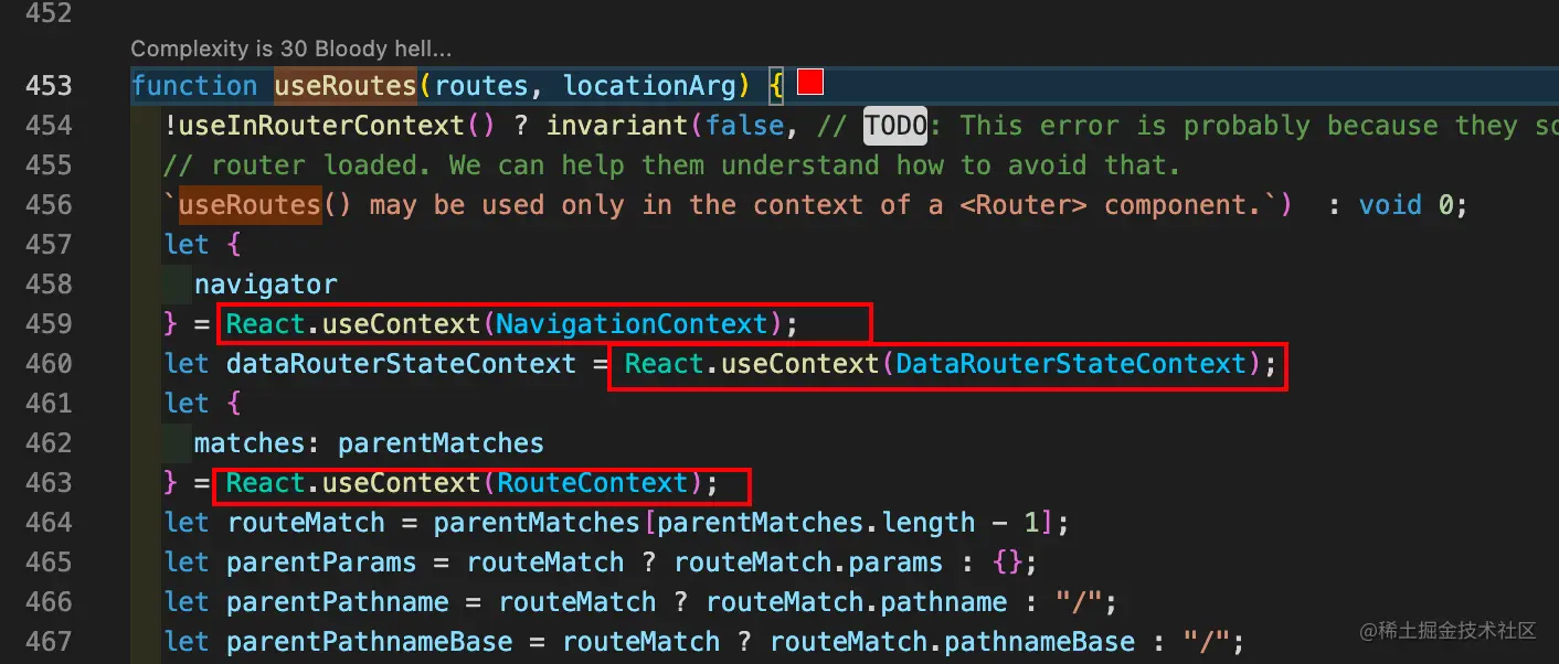 我们找到useRoutes之后发现,此函数里竟然有三个useContext。我们都知道,Context有个特性,只要其共享的value有一个变化了,都会触发相关Consumer子组件的变化。