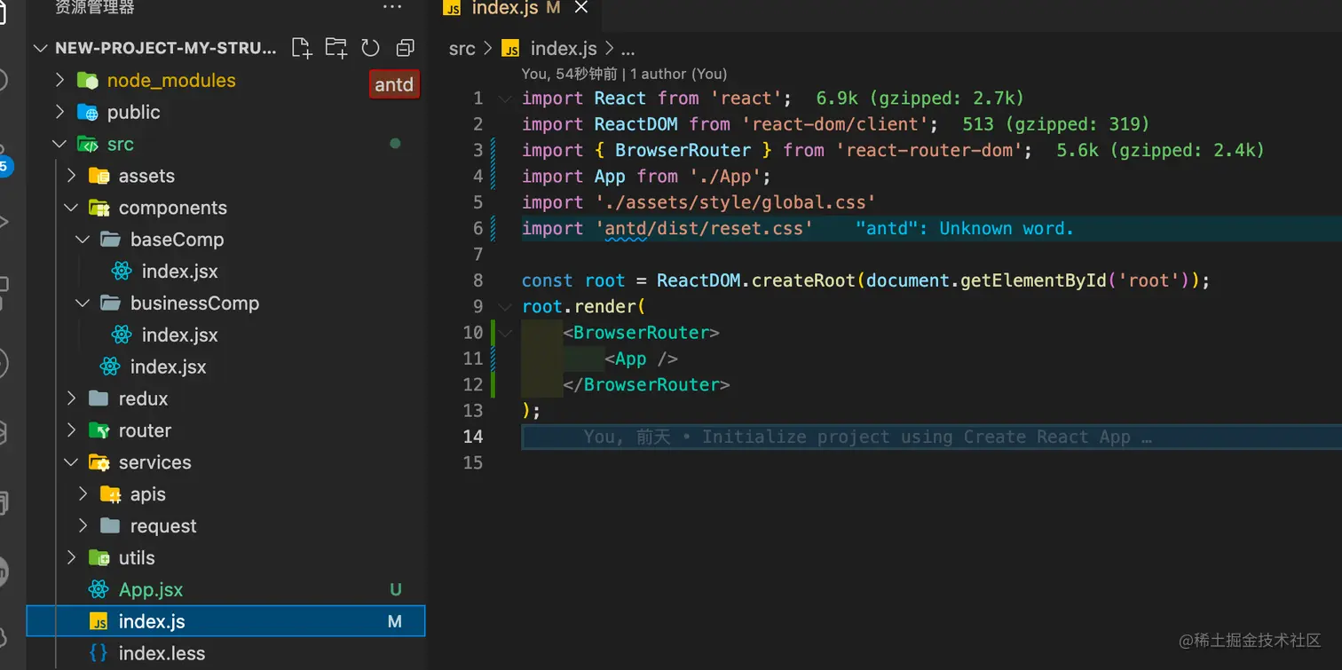 我们在配置路由之前,首先要做的是选定当前项目的路由模式 BrowserRouter 或 HashRouter。一旦选定后,我们要用此组件去包裹整个项目的根组件(一般是App组件)如下所示: