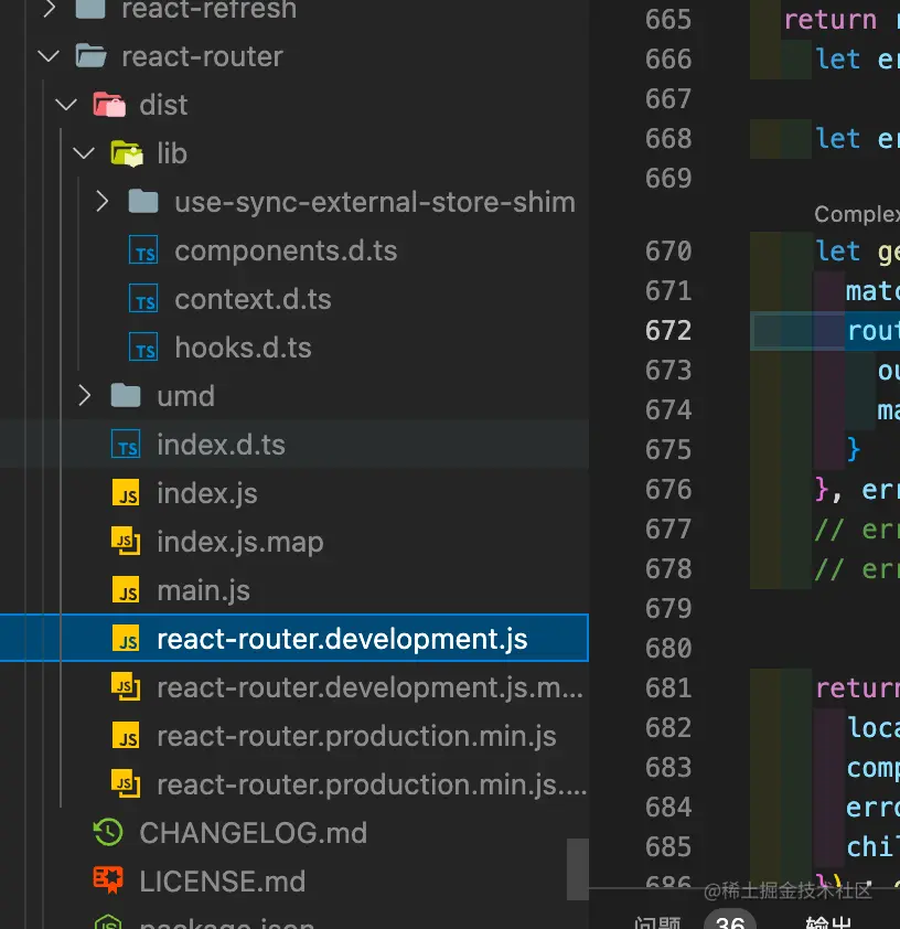 想知道答案,咱还得看看useRoutes是怎么实现的。我们直接在项目里node-modules中找到react-router(react-router-dom 也是用的这里暴露出来的钩子 ),并在此文件夹里找到.development.js 文件看下router的源码