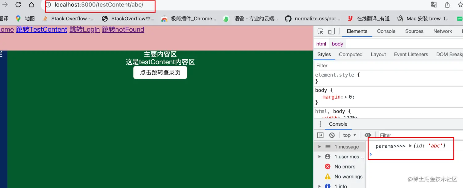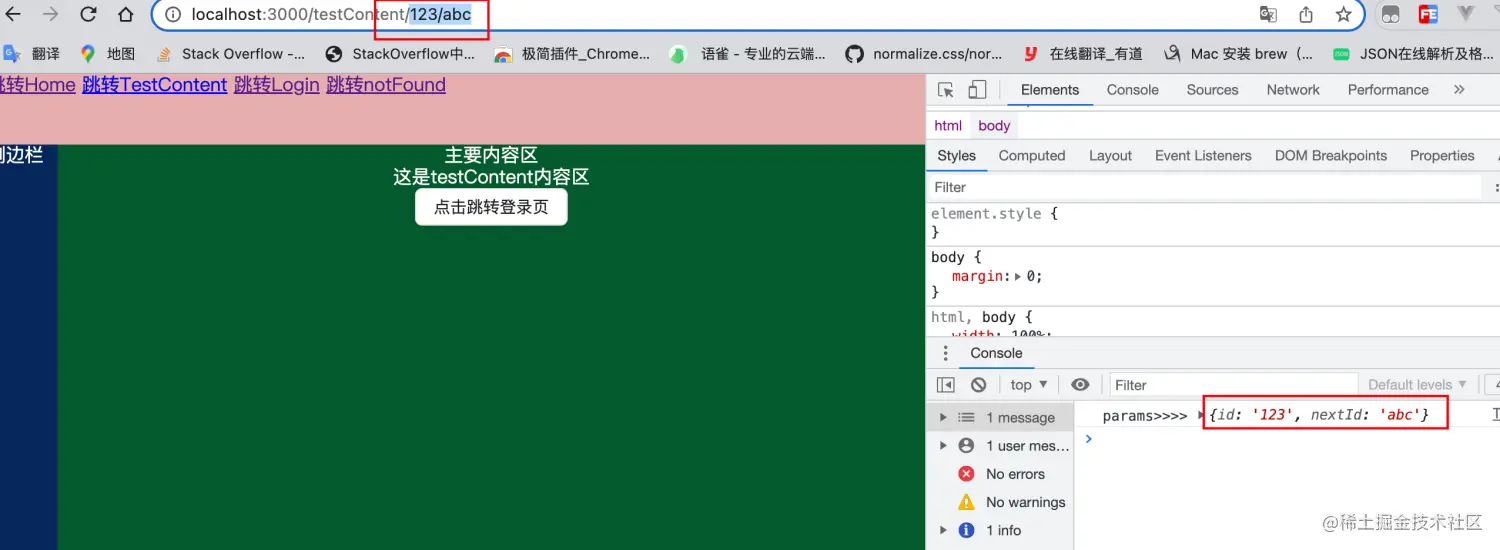 地址栏输入 /testContent/123/abc ,如下图所示,我们的params参数里把path里所有动态路径部分的参数都拿到了。现在我们得出结论,useParams获取的是所有动态变化部分的路径参数。