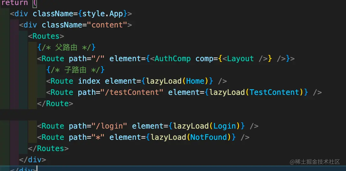 我们routes对象维护好之后,将routes传到useRoutes即可。下面我们对App.jsx 文件做下调整,将原来整个Routes部分用useRoutes钩子替换掉。