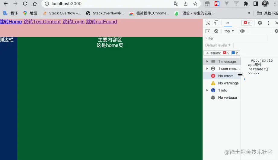我们换成useRoutes方式来进行管理路由后,有细心的小伙伴可能会发现一个问题:每当我们切换路由时,useRoutes所在的组件都会进行一次rerender。而我们使用Routes组件的方式则不会出现这种rerender的问题,为方便查看是否rerender,我们在App.jsx文件的加一个console来验证。