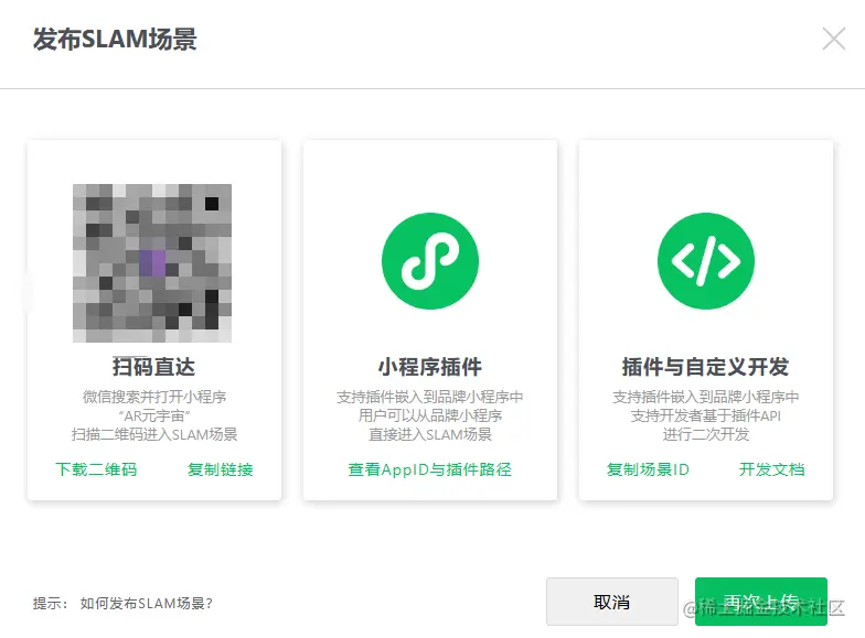 如果想在自己的小程序中调用AR效果图,可以将小程序的AppID授权在微信小程序后的后台中,最后再微信开发工具中调用SLAM第三方的组件进行调试,保存好上传版本到微信后台审核,发布之后就可以在小程序线上进行展示了。