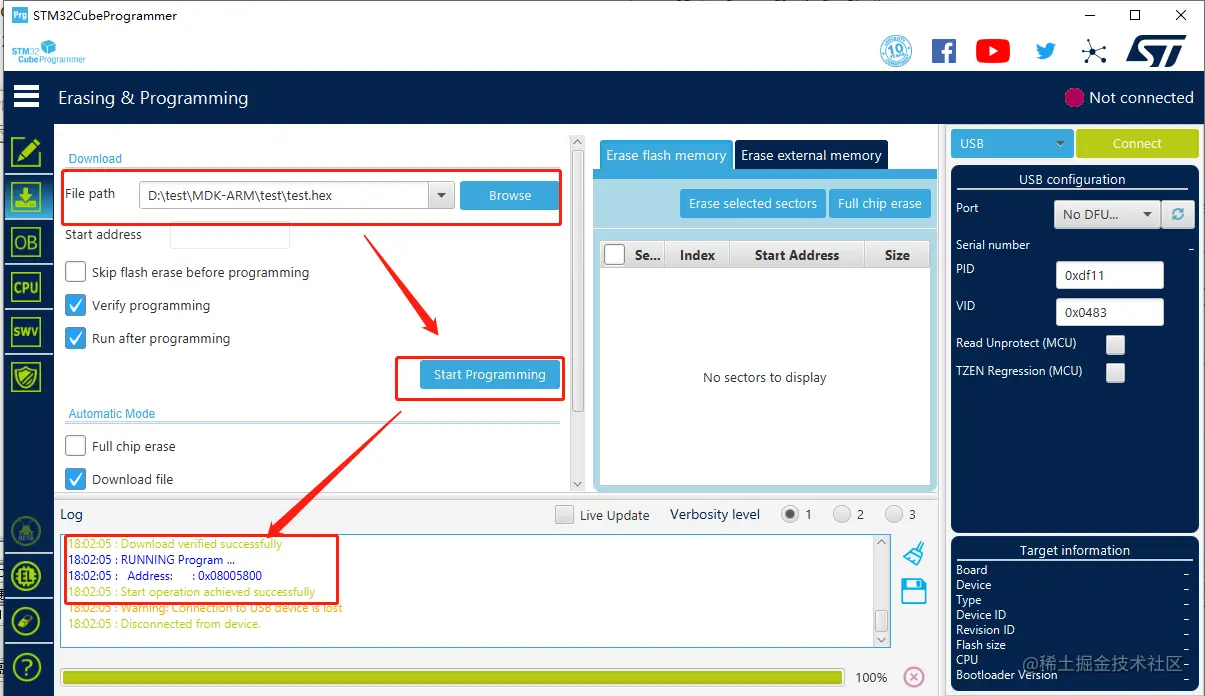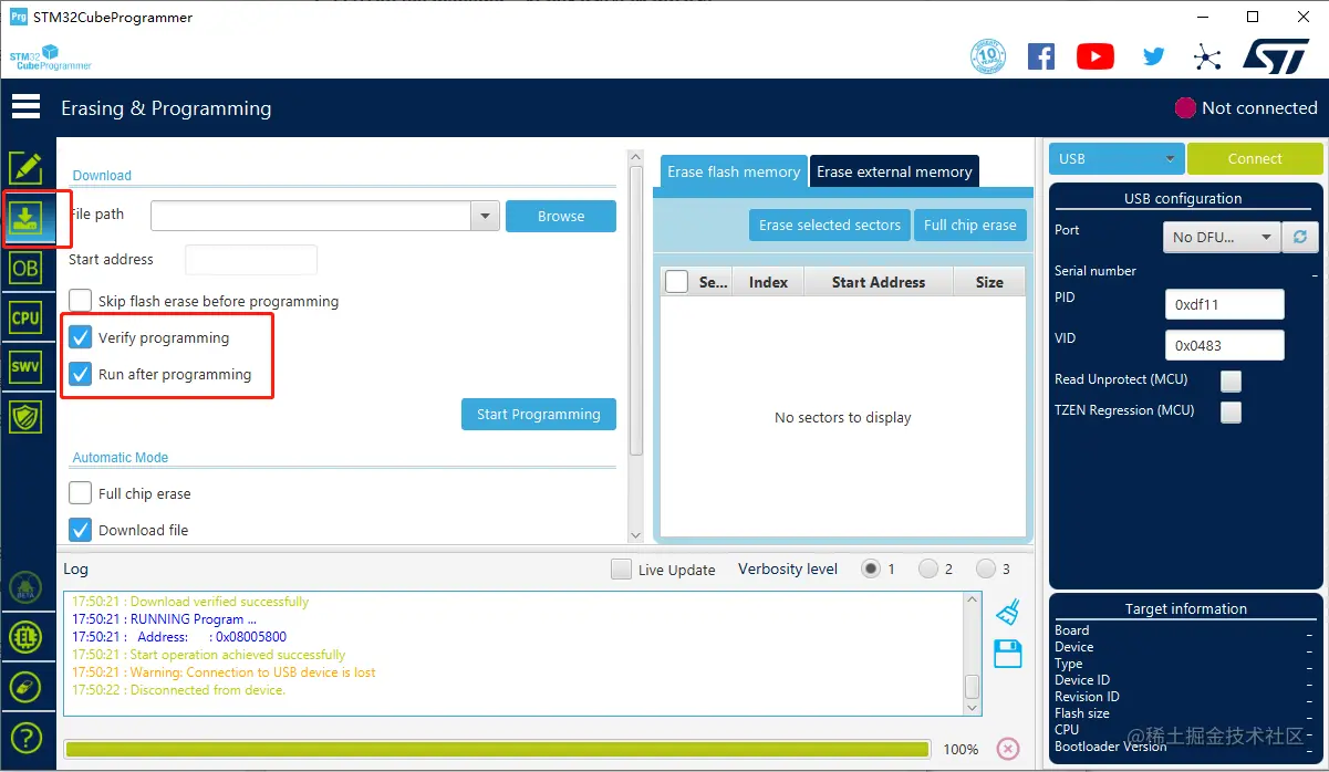 打开STM32CubeProgrammer,切换到Erasing&Programming擦除和烧录界面,勾选烧录验证和烧录后重启选项