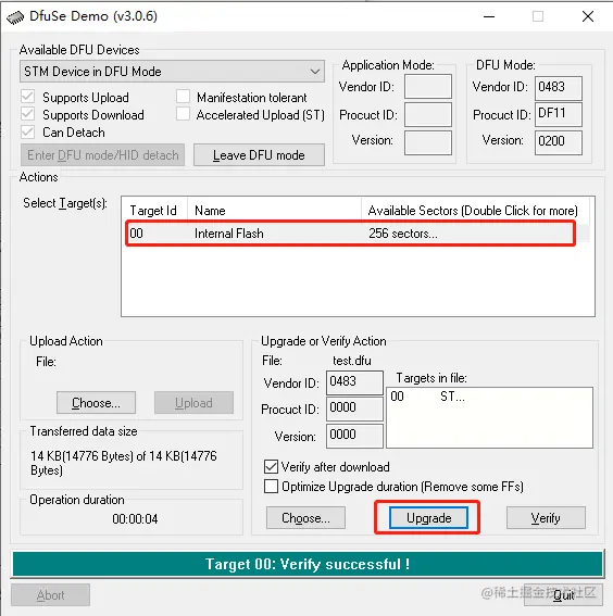 点击Choose加载之前转换的.dfu文件;勾选校验功能。