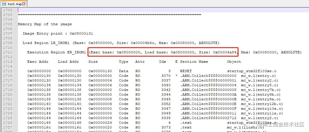 打开 map 文件后,查看文件最后部分的区域,可以看到一段以 “Memory Map of the image” 开头的记录(若找不到可用查找功能定位)
