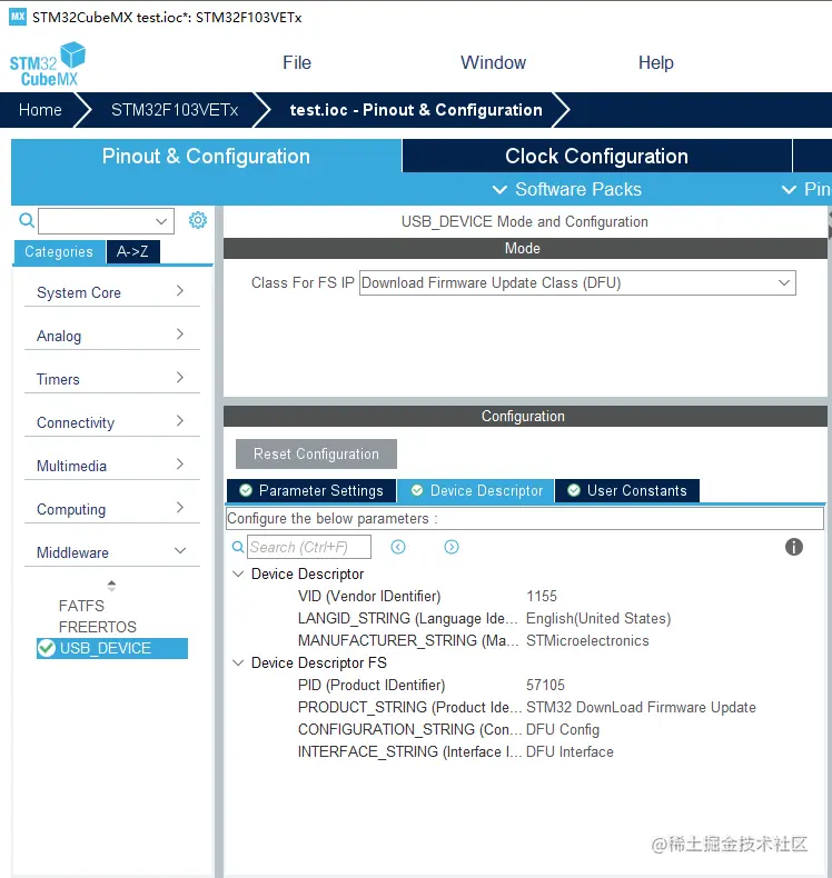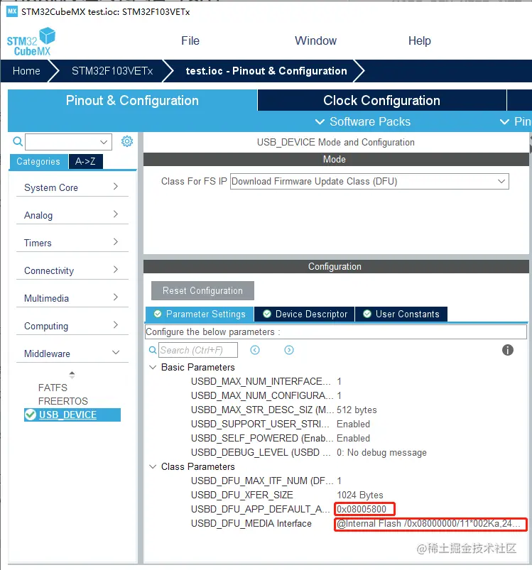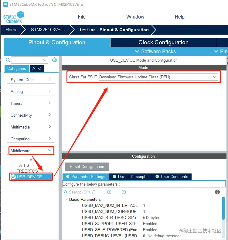 在 Middleware 中选择 USB_DEVICE 设置,在 Class For FS IP 设备类别选择 Download Firmware Update Class(DFU) 固件升级类。