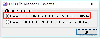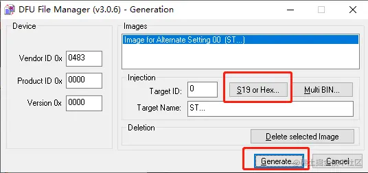 这里的Target ID有不同的值,其中0代表片内Flash;1代表外部Flash;2代表外部Nor Flash。因此我们这里选择0,点击S19 or Hex选择hex文件即可生成DFU文件。