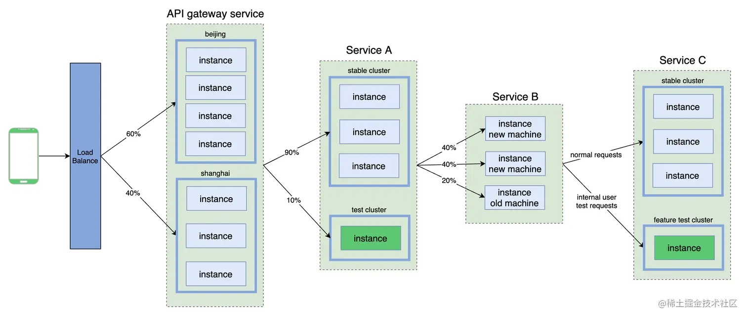 在微服务架构下,我们可以基于地区、集群、实例、请求等维度,对前端流量的路由路径进行精确控制。