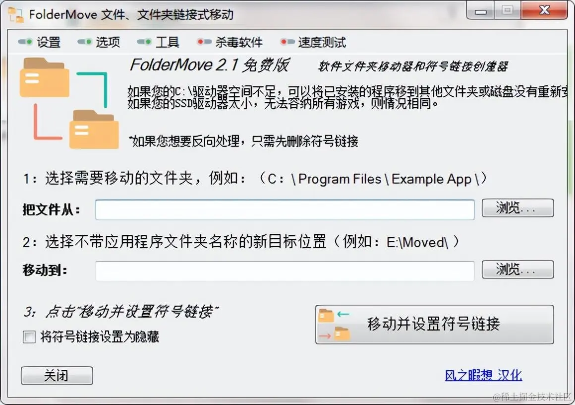 FolderMove是一款多功能实用的文件夹移动软件,FolderMove可以将软件从一个路径移动到同一硬盘上的不同路径或同一台计算机上的另一个硬盘。将软件或游戏的安装文件夹移动到其他驱动器,而不会破坏安装程序也不需要重新安装,比较适合电脑新手C盘爆炸时抢救电脑用。