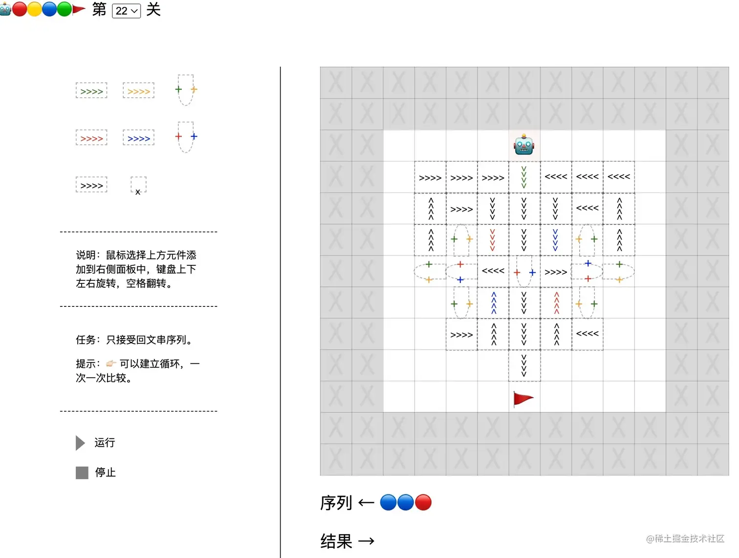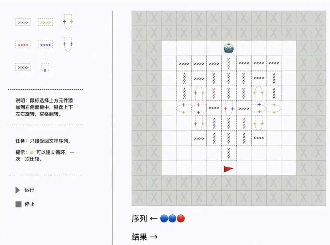 这个小游戏的规则是,将左侧的元件放置到右侧的面板上,然后点击运行,机器人会沿着元件指定的路径运行,并影响地步序列的状态,最终按照任务的要求完成,即可过关。