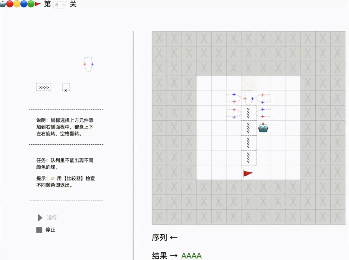 例如上面的截图是第五关,任务是“队列里不能出现不同颜色的球”,也就是说如果队列中只有红球或只有蓝球,要把机器人移动到 🚩 处,否则将机器人移到任意其他空格。