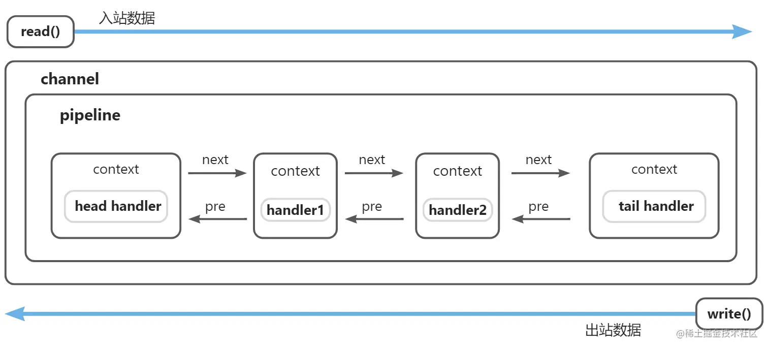 netty 中的 pipeline 则采用了双向链表的形式来组织所有处理器。netty 在设计上认为,对于入站的数据来说(收到的数据),给链路中的所有处理器都提供一个处理机会,出站同理(这里讨论的是 channel 提供的写出方法,对于 context 提供的并不适用)。在 netty 中,处理器的结构示意图如下: