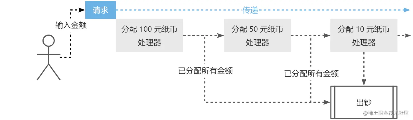 责任链模式建议我们将一块一块的逻辑(分配 100 元纸币、分配 50 元纸币等)封装成为多个对象,并且将这些对象按照顺序进行组织,成为一个处理请求对象的链条。这样我们就可以将请求投递给链条,请求在链条中按照顺序逐个传递,每一个处理对象可选择对请求处理或者不处理。此时出钞的过程如下图所示:
