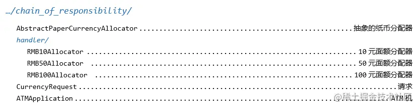 AbstractPaperPasCurrencyAllocator.nextAllocator()提前构造好链路【RMB100Allocator -> RMB50Allocator -> RMB10Allocator】。当用户发起兑换现金的请求后,请求首先到达 100 元的分配处理器。在该处理器分配完毕后,会根据请求中剩余的金额(CurrencyRequest.toAllocateAmount)决定是否继续向后继处理器传递请求,如此往复。直到请求从链路中脱离时,应用开始出钞(CurrencyRequest.cashOut()),如果全部金额正常分配,则为用户提供现金,否则告知用户系统无法提供本次服务。
