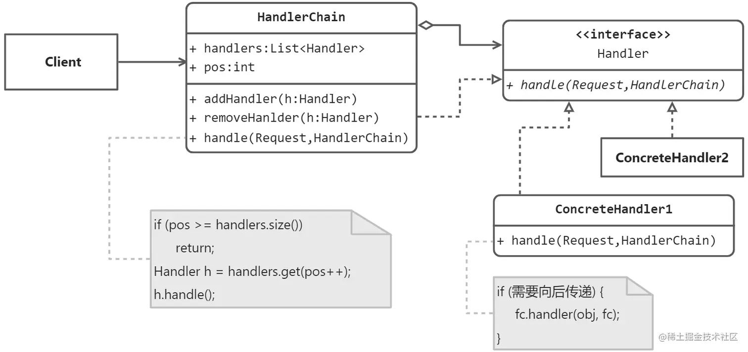 在这个类图结构中,整个链路由 HandlerChain 负责维护,提供了增加处理器,删除处理器等方法。除此之外,HandlerChain 本身也实现了处理器接口,在它的处理方法(handle)中,也负责请求在整个链路中的传递。它内部维护了当前的处理器在整个链路中的索引,在客户端发起一个请求后: