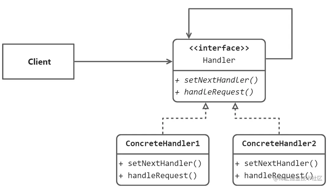 责任链模式的类图结构如上所示,在责任链模式中,有如下的参与角色: