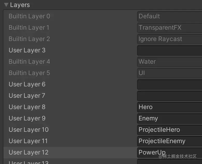 - 菜单栏中执行 Edit > Project Settings > Physics 命令可以设置项目中不同Layers之间的碰撞规则。