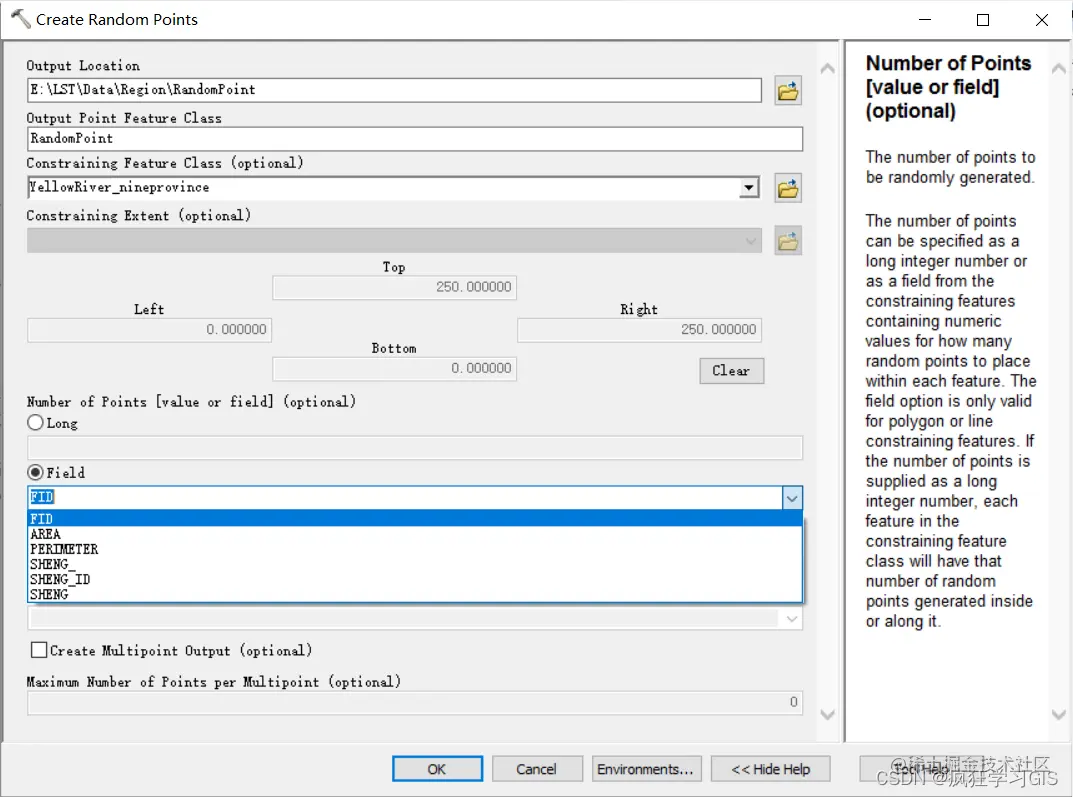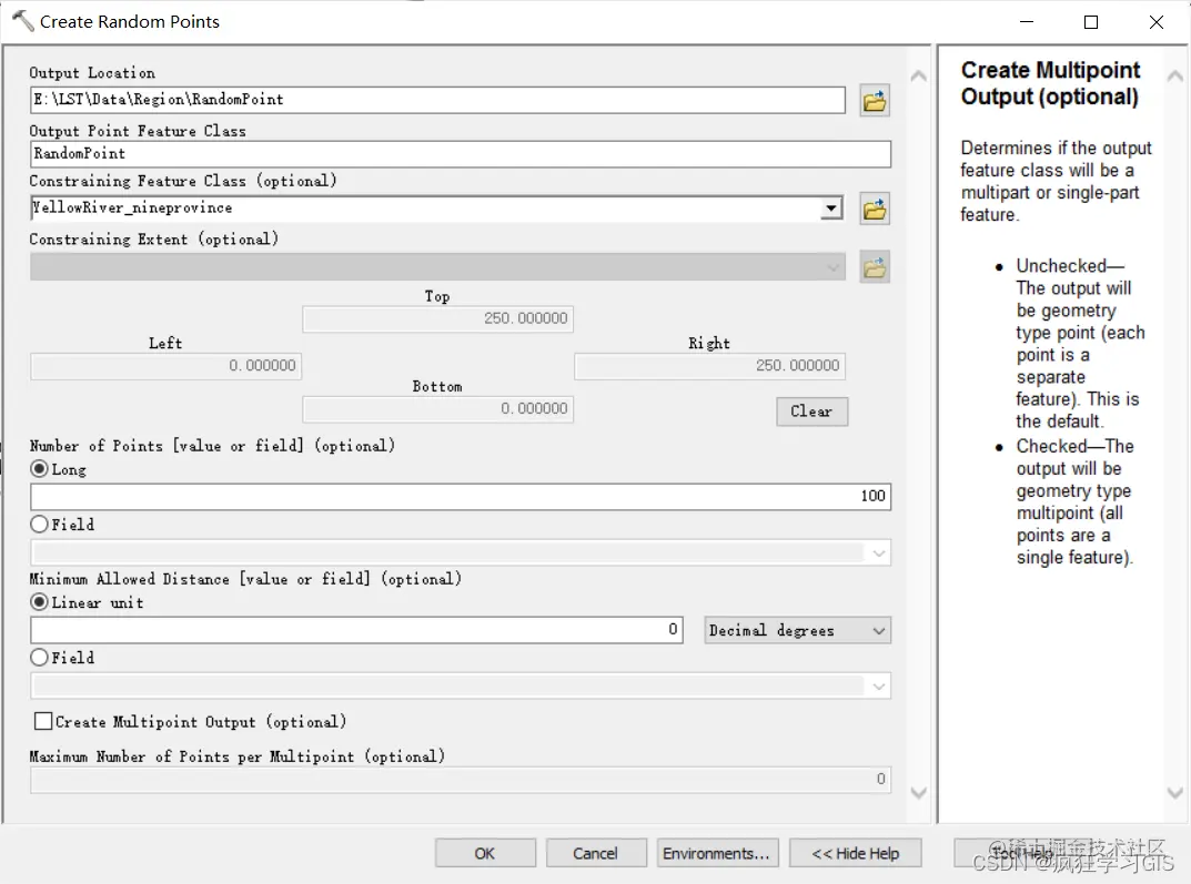 这个工具的参数有很多,我们逐一介绍。“Output Location”为生成点要素的保存路径,“Output Point Feature Class”为生成点要素的名称;“Constraining Feature Class (optional)”为我们生成随机点的范围——这一项为可选项,如果我们选择了这一项,那么随机点就会在这一项所选的点、线或面矢量要素范围内生成;如果我们不选择这一项,就可以在下一项“Constraining Extent (optional)”中选择我们的栅格图像作为范围。“Number of Points [value or field] (optional)”为生成点的个数,如果我们选中“Long”,那么就直接输入整数即可;如果我们选中“Field”,那么就依据“Constraining Feature Class (optional)”这一项所选的点、线或面矢量要素的属性表中某一个字段作为点的个数;这里还需要注意,如果我们在“Constraining Feature Class (optional)”这一项选中了包含多个要素的要素集,那么“Long”所输入的点的个数其实是该要素集下属每1个要素中所生成的点的个数(这里大家看不明白也没关系,我们在后面会用一些例子来说明)。“Minimum Allowed Distance [value or field] (optional)”表示所生成点之间的最小距离,同样是可以用直接输入距离或者用矢量要素的属性表字段来赋值。最后一个勾选项表示是否将输出的随机点结果作为一个整体的要素——如果不勾选此项,那么输出的随机点要素集中,每1个点就相当于是1个要素;如果勾选此项,那么输出的随机点要素集中,所有点整体相当于是1个要素;如果勾选了这一项,就将激活最后一个输入框,表示如果将多个点整体当作1个要素的话,该要素最多可以含有多少个点。
