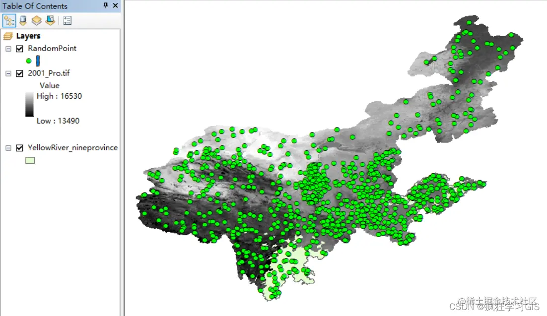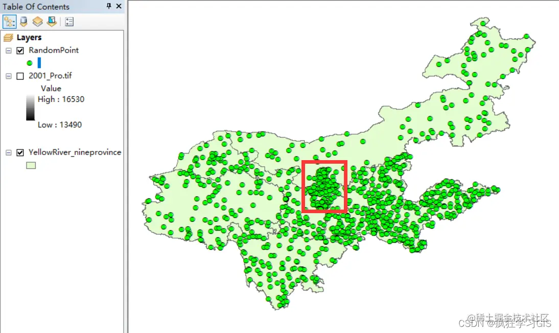 我们将这个9个省的面矢量要素图层和刚刚生成的随机点矢量要素放在一起看,大家就看得更清楚了——每个省都是100个点,但由于内蒙古地区面积大,因此这里100个点就看起来比较疏松;而宁夏(下图中红色区域)由于面积小,所以100个点在这里就显得尤为密集。