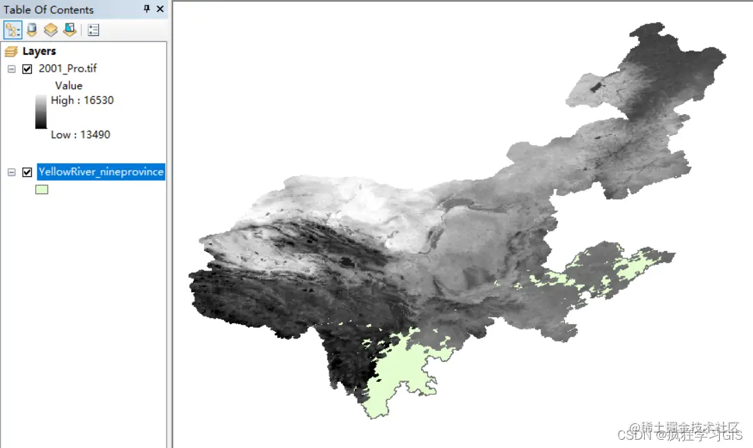 另一方面,我们还已知该栅格图像对应的空间范围的面要素矢量图层,如下图所示。其中,由于该栅格图像存在无效值NoData,因此可以看到栅格图像是没有完全遮盖矢量图层的。