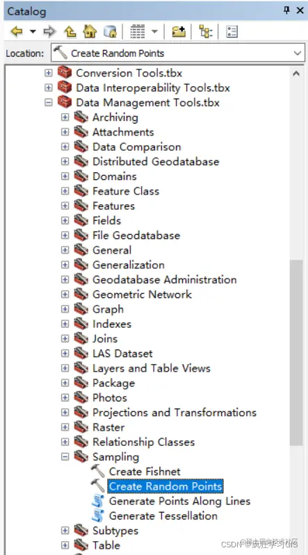 接下来,就可以开始随机点的选取。在软件中依次选择“Data Management Tools.tbx”→“Sampling”→“Creat Random Points”。