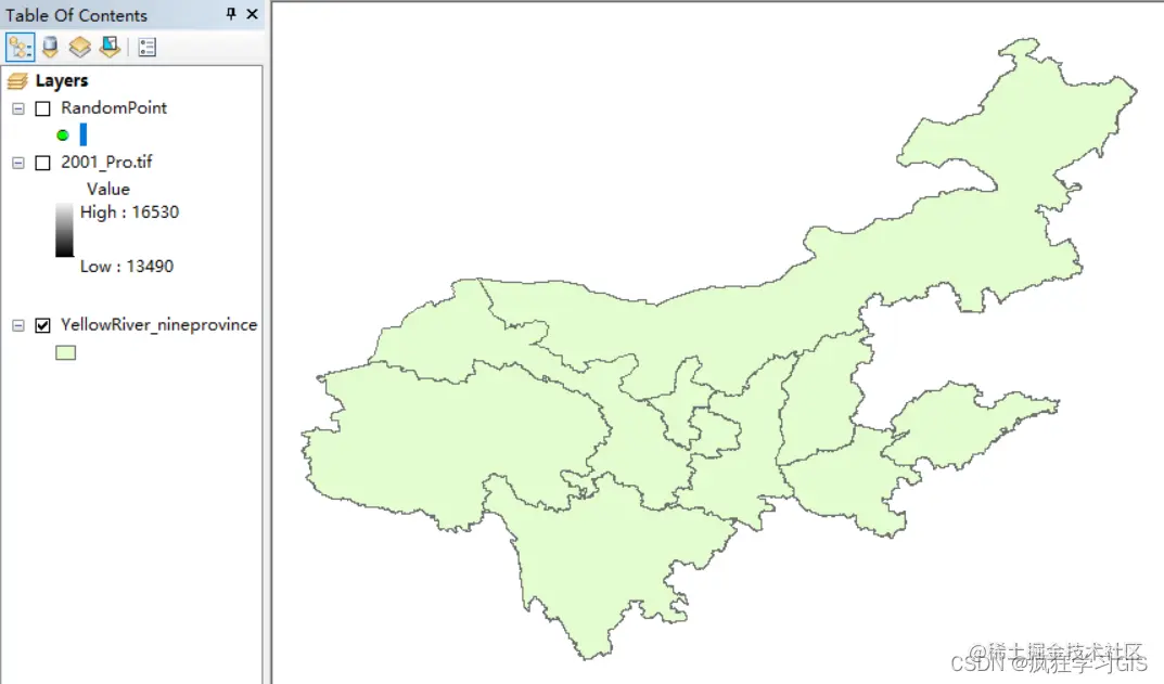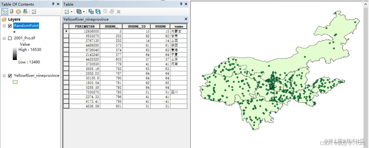 在刚刚的例子中,我们“Constraining Feature Class (optional)”这一项选所用的面矢量要素图层如下所示,可以看到其是一个包含有9个省(9个要素)的要素集;那么结合我们前面介绍的,在“Long”中设定了点的个数是100,实际上是在每1个省份(每1个要素)中生成100个点,因此最终得到的整体结果是900个点,从而导致我们的随机点结果看起来就这么密集。