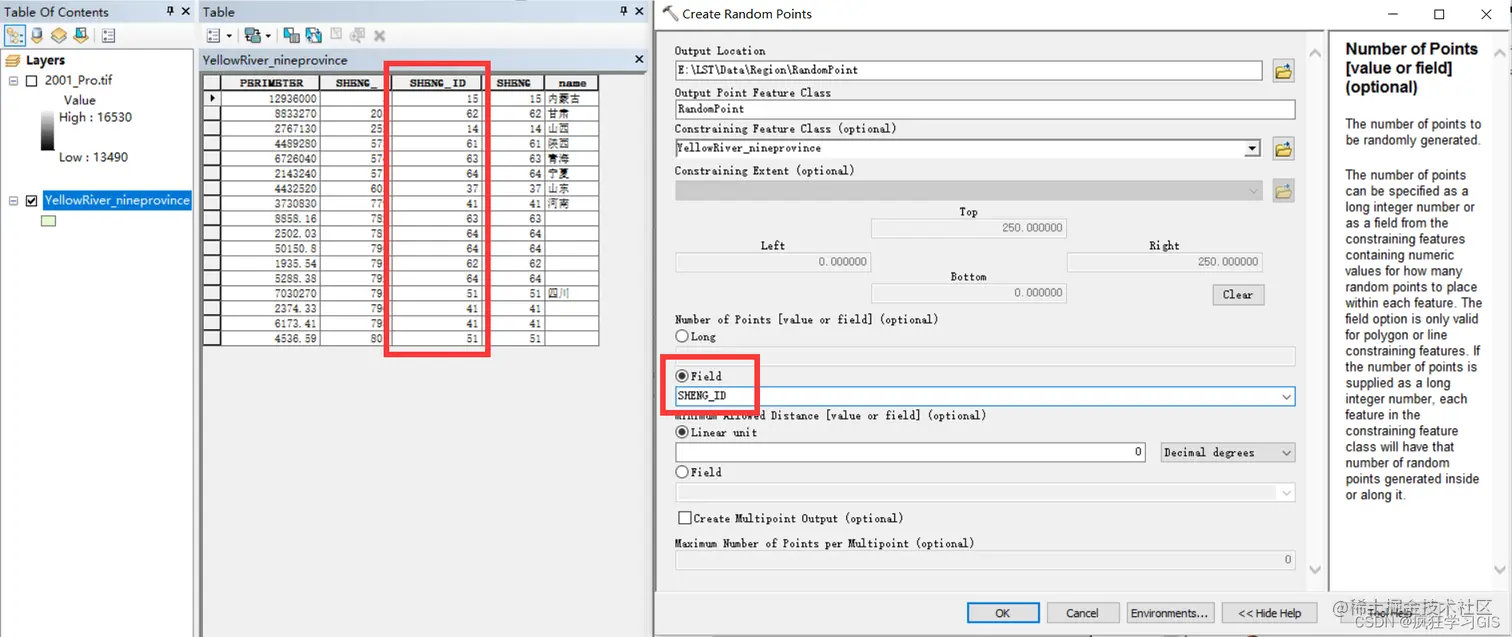 其中,我们选择用矢量图层的属性表字段来作为约束每1个行政区(每1个要素集)中生成随机点的个数。这里我们就选择用下图所示的这个字段作为输入字段。