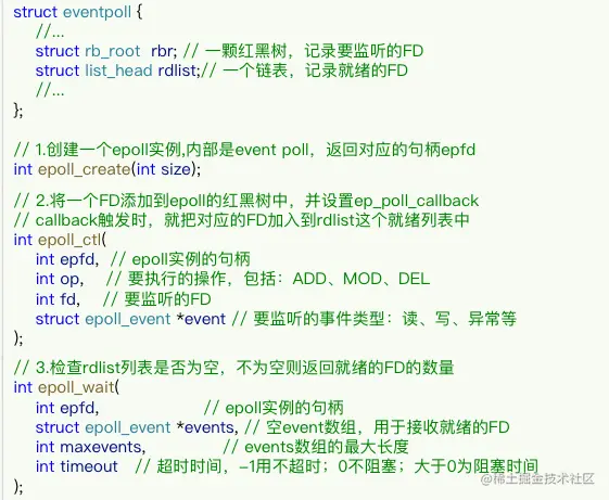 - epoll_ctl。这个函数的作用是监听FD,也就是将FD从用户空间拷贝到内核空间,epoll_wait是等待FD就绪。将来如果有新的FD,执行一次ctl加入就可以了。并且一直存在,